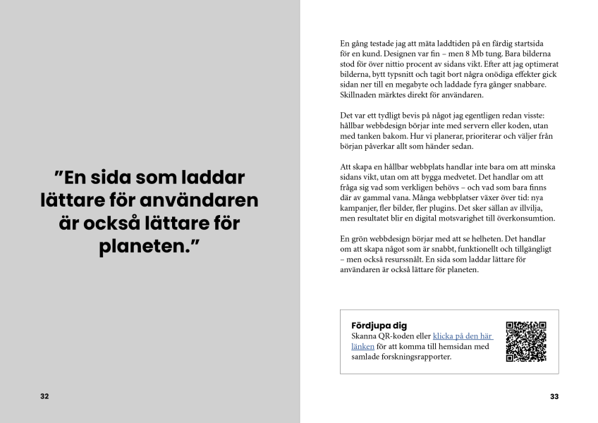 Boken blandar berättelser, fakta och handfasta råd. Du får veta hur små designval kan minska energiförbrukningen, hur kod och hosting påverkar klimatet, och hur AI och nya tekniker förändrar spelplanen.