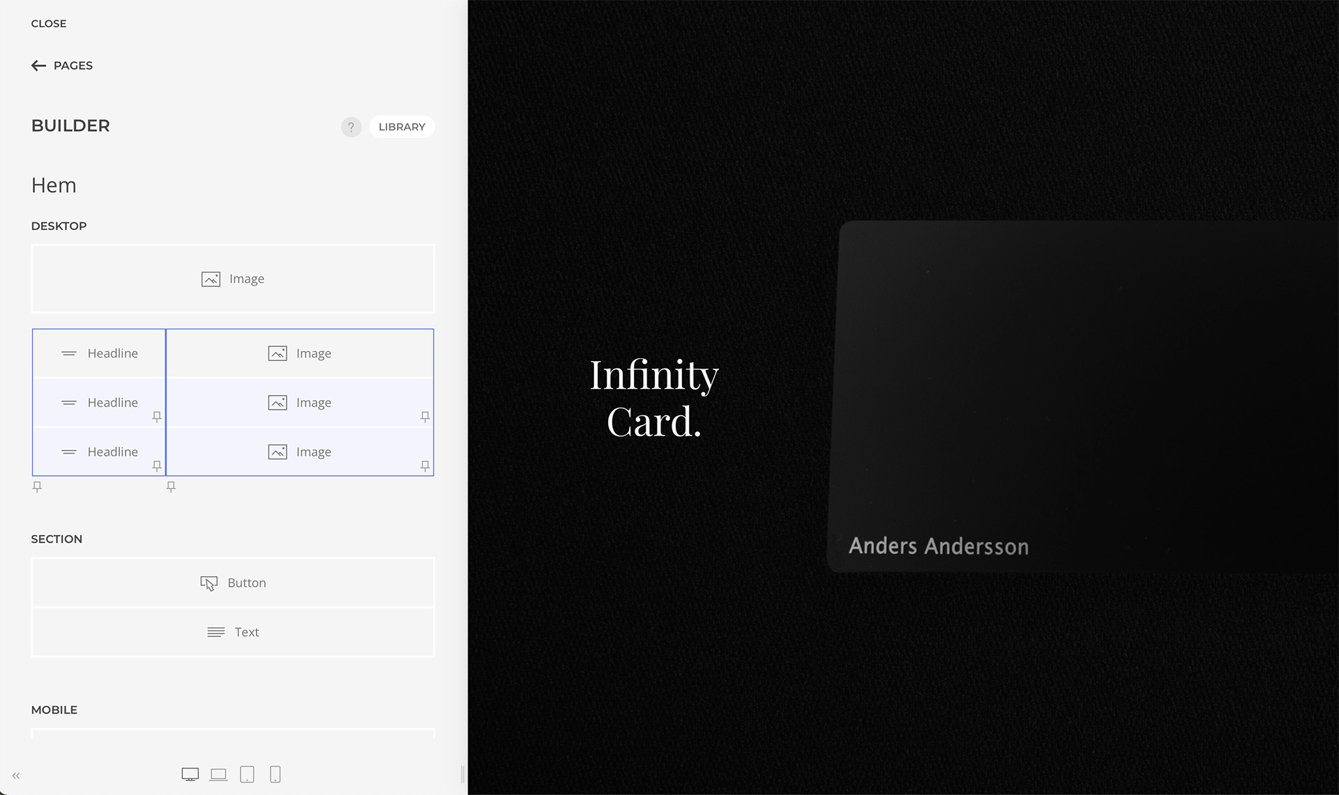 Med målet att skapa en hemsida med en exklusiv look tog vi fram en färgskala baserat på en mörkgrå kostymtextil. Resultatet blev en minimalistisk och stilren design som bokstavligen guidar besökaren fram till köpet. Som en del av marknadsföringen av det digitala visitkortet producerades även en enkel promotionvideo.