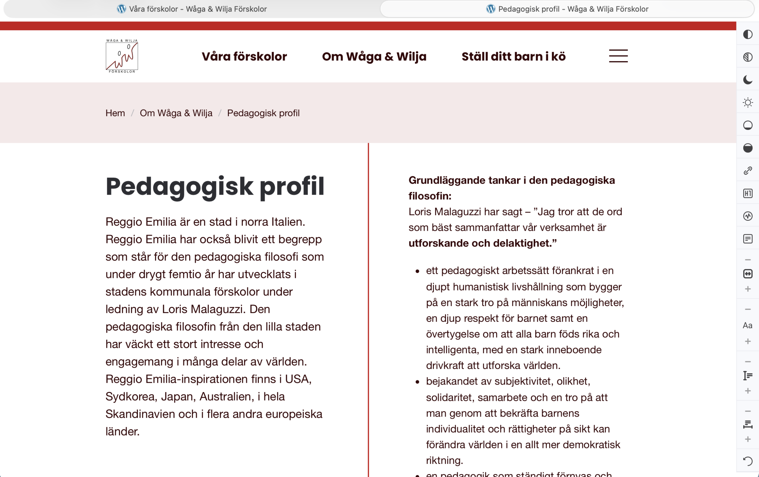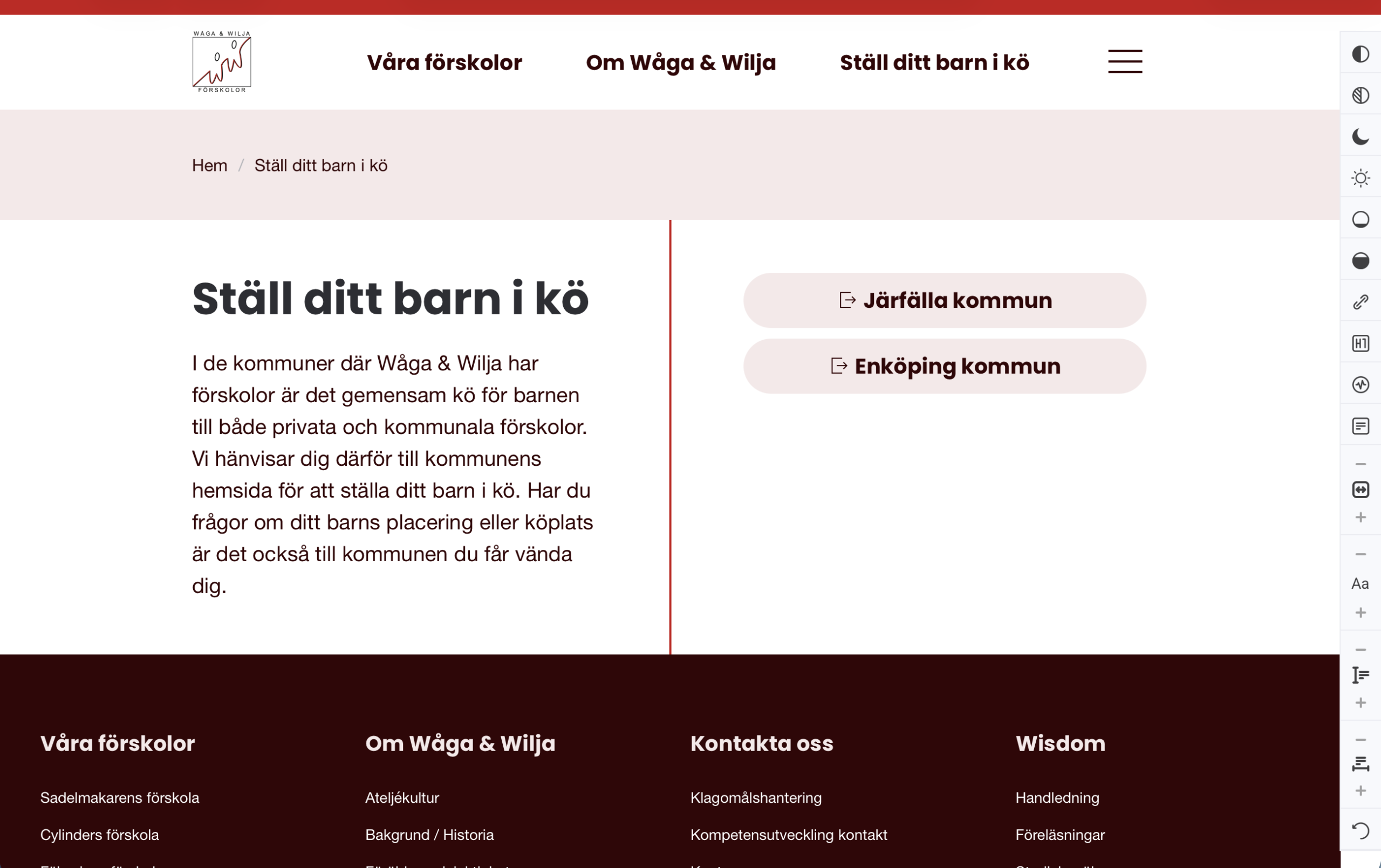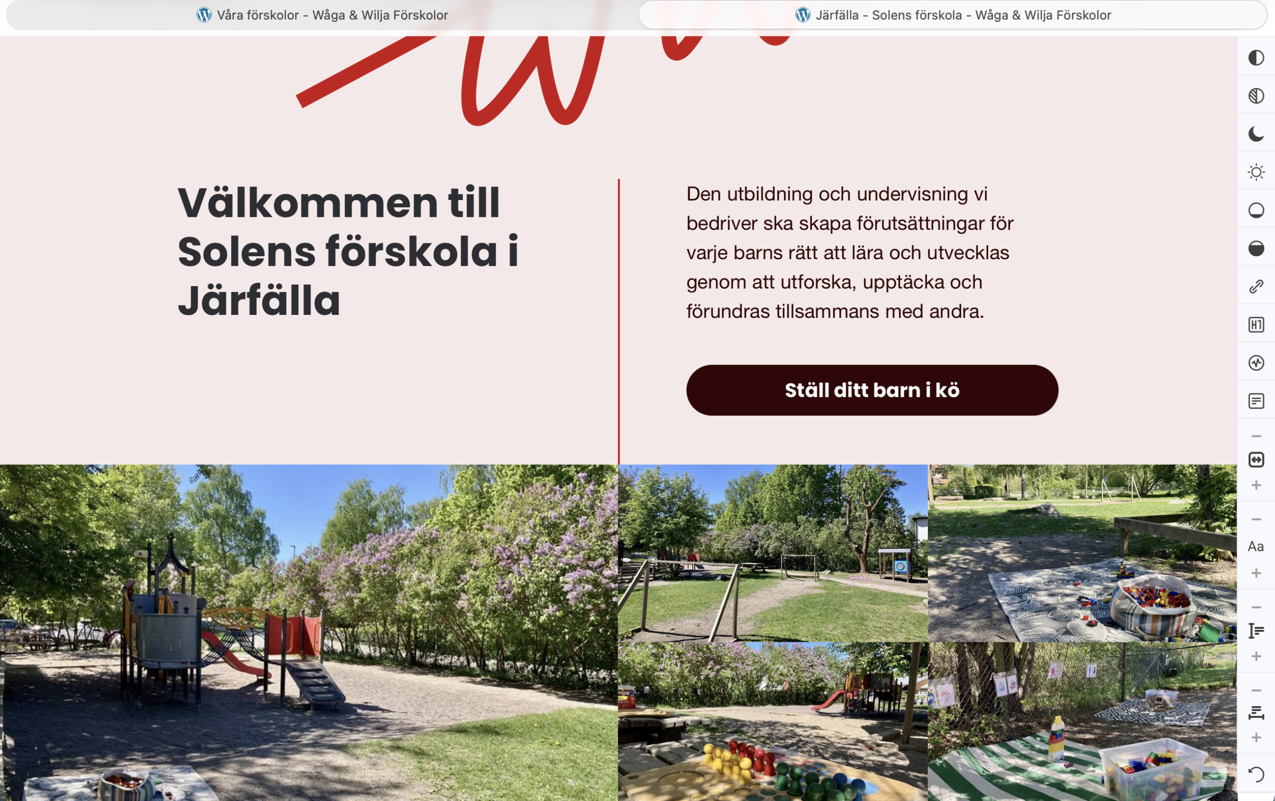 Eftersom verksamheten består av flera förskolor skapades separata landningssidor för varje enhet. Det gör det lätt för besökare att hitta rätt förskola och samtidigt få en tydlig bild av Wåga & Wiljas helhet.
