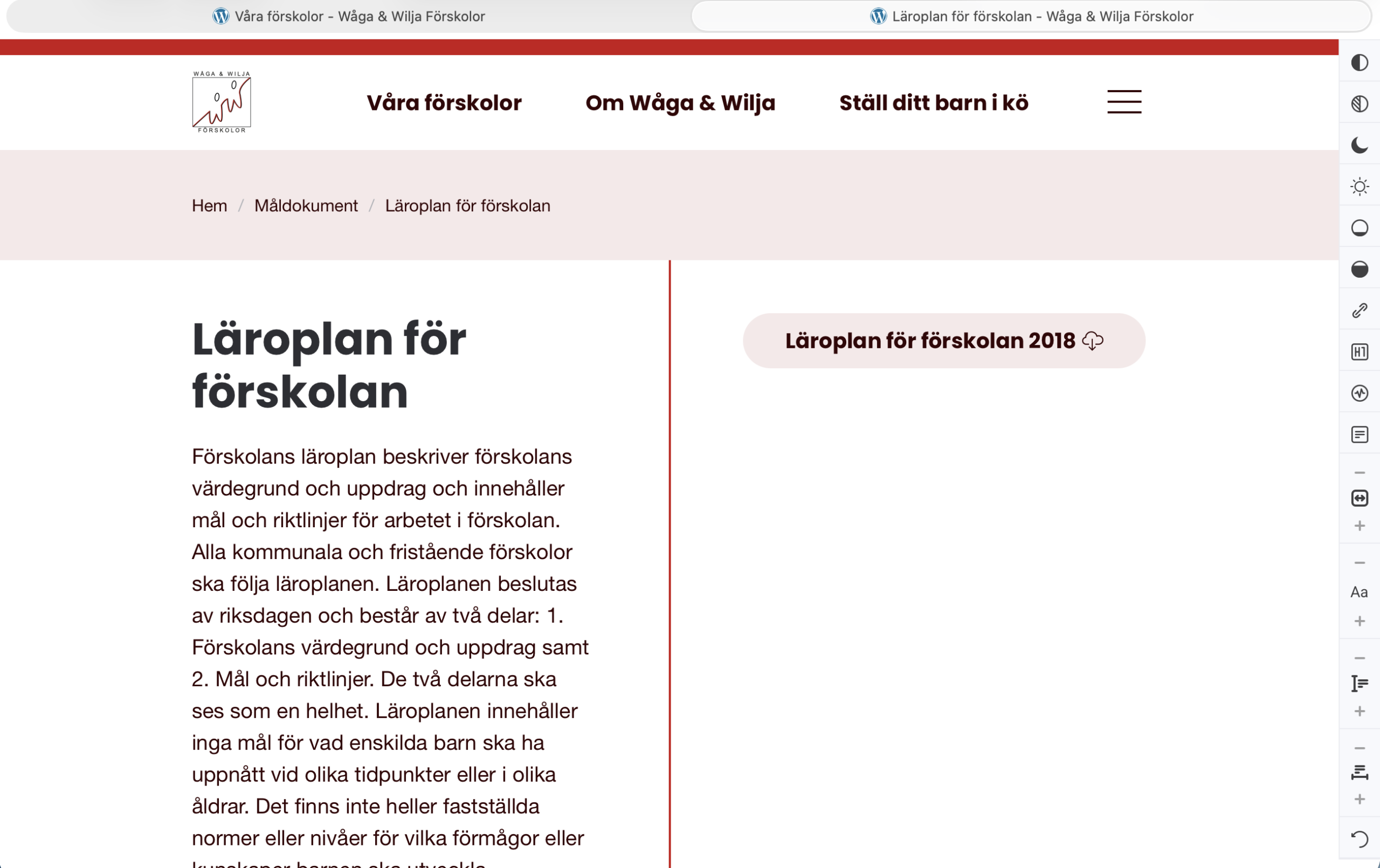 Resultatet blev en modern och inbjudande webbplats som riktar sig till presumtiva föräldrar och hjälper Wåga & Wilja att presentera sina förskolor på ett tydligt och förtroendeingivande sätt.